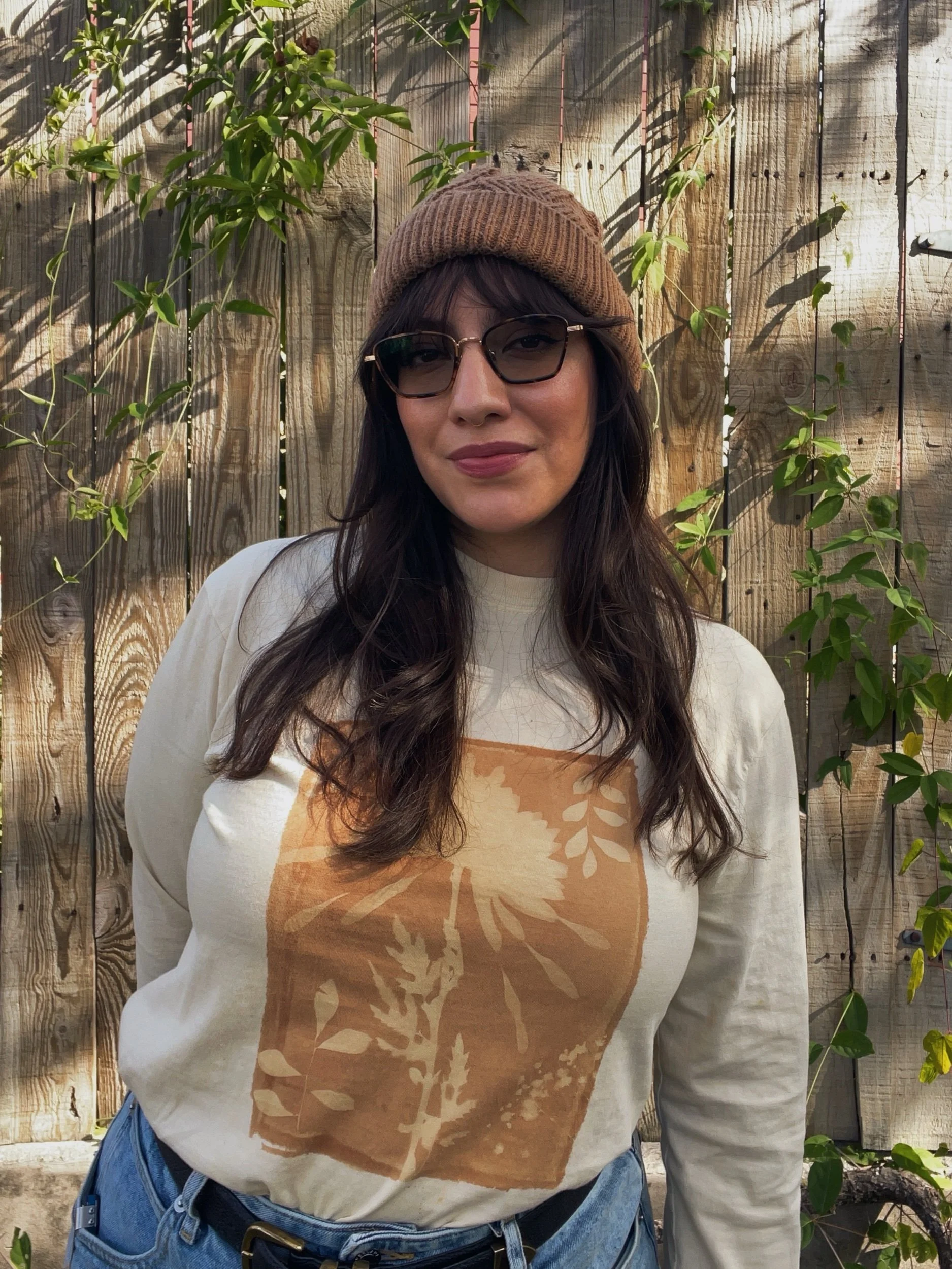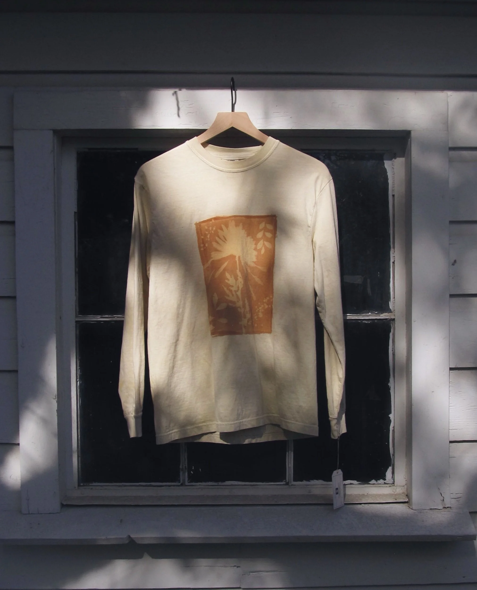 Sun printed on comfort colors long sleeve. Unique floral impresssion on sunnier days. Available in toned tanned on cream color shirt.